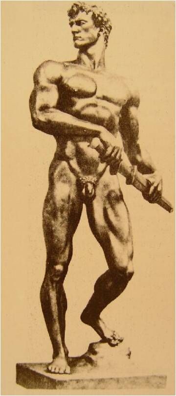 It is clear that true German art represents the “Aryan beauty”. No doubt it bears Ancient Greek connotations extensively: it has partial sense of perspective, and it seems as if the figures were painted from the models of ancient statutes. Though mimetic in a technical sense, it doesn’t need a perspective; its aim is only to underscore the very physicality of “Aryan beauty” and its bodily perfection. The space is not an important agent in this painting. It is the same for time. Why would Ziegler make this kind of a painting as an official painter of the Nazis at 1937? As an educated painter he certainly knows what Ancient Greek art was. Does “true German art” correspond to an imitation of Ancient Greek art? One last illustration to explain this explicit link between Greek art and “true German art” could be useful. This is a sculpture made by the official Nazi sculptor, Arno Breker.
