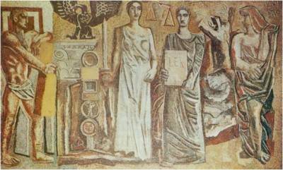Futurist painter Mario Sironi, who devoted himself to fascism after World War I, was among the artists who insistently turned to Ancient Roman motives in his paintings. He introduced the concept of “mural painting” which is according to Sironi, “a social painting par excellence.” He aims to achieve totality in mural painting. Sironi states that, “fascism is a style of life; it is life itself for Italians.” Consequently one is reminded of what Lacoue-Labarthe and Nancy said in their article in describing myth as a “living” entity. Sironi, like Hitler, also underlines that “the individualist conception of ‘art for art’s sake’ is dead.” Besides, what is crucial in Sironi’s manifesto is that his understanding of art gains a religious value when he declares: “Thus art will once again become what it was in the greatest of times and at the heart of the greatest civilizations: a perfect instrument of spiritual direction.” Hence, Sironi insists that by means of mural painting, a “Fascist style” will arise “with which the new civilization will be able to identify.” The endeavour to constitute a subject for identification as Lacoue-Labarthe and Nancy suggested already exists in the champions of Italian fascist art. Yet, eventually what Sironi produces as “authentic fascist art” is an imitation of Romans; it manifests nothing but the desire to revive a Romanic myth and projecting it onto fascist Italy. Nonetheless Sironi is well aware of his imitation when he says, “the art of pagan and Christian Rome is closer to us than the Greek.” Sironi’s emphasis remarks it is as if fascism was an eternal feeling, kind of an omnipresent entity which binds Romans to Mussolini’s fascist regime. Therefore, though he doesn’t explicitly claim to remove “time and space” from the painting like Marinetti, Boccioni and Hitler do, he comes to insist that fascist art is on the same plane with Roman art; and that the future of fascism lies in the living myth of Ancient Rome which has to depicted on the walls of every street in Italy, as seen in this work of Sironi below.