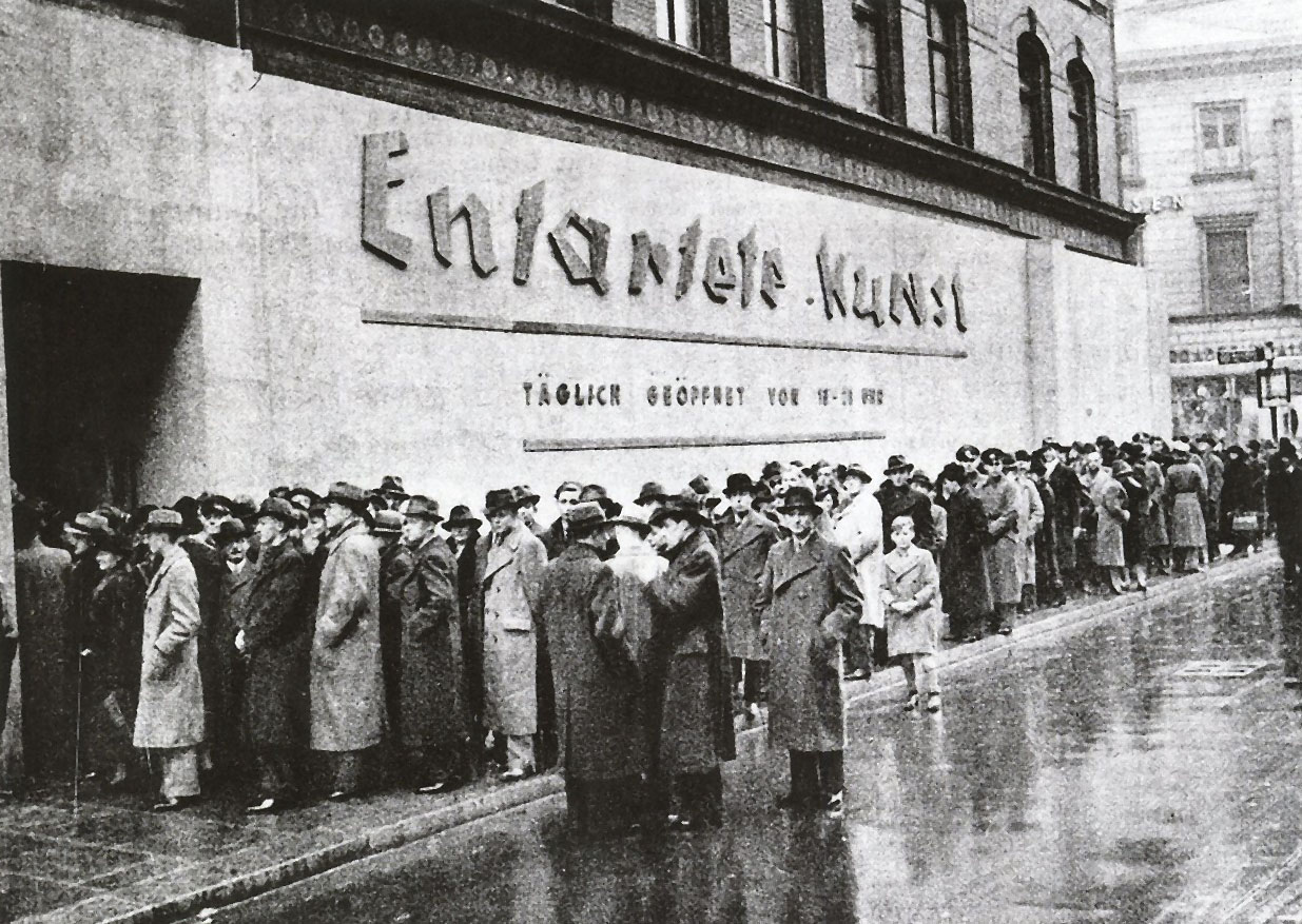 -I- Degenerate Art This is a photograph taken at 1937. It pictures Adolf Hitler’s visit to the “Entartete Kunst”, meaning “Degenerate Art” exhibition. Adolf Ziegler, favoured painter of Hitler is also present. On the wall, there writes “Dada”, the modernist, avant-gardist anti-art movement started at 1916 in Zurich. The name of the painter George Grosz, one of the members of Dada movement, can clearly be seen on the wall. The names of the painters whose works were exhibited as “degenerate art” included Paul Klee (a favourite of Benjamin, also worked at Bauhaus for some time before it was shut down by the Nazis), Max Ernst known for his Dada and Surrealist paintings, Marc Chagall, a Russian Jew who was an expressionist, Wassily Kandinsky, an abstract artist and an expressionist who worked together with Klee at Bauhaus and other notable figures in the history of art such as Emil Nolde, Max Beckmann and Piet Mondrian. A person who takes a brief look at this photo without knowing the story behind it would probably be surprised to see Hitler visiting an avant-gardist exhibition with his officials and specifically with his official painter, Ziegler who was in no way interested in avant-gardist and modernist art movements of the century. Then, was Hitler a modernist in terms of art, championing the avant-gardists of the era? Why was he present there?
